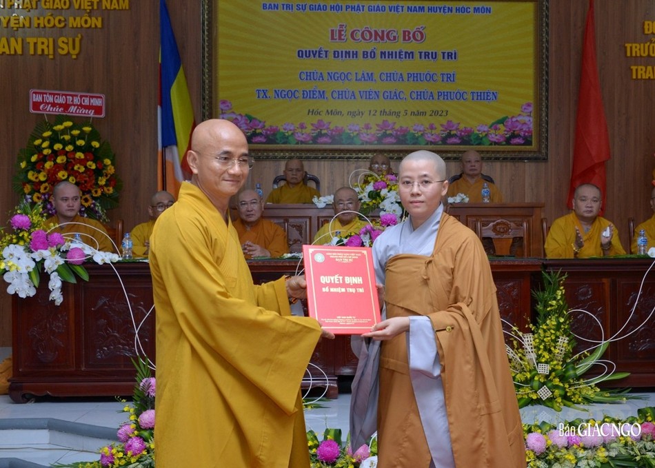 Đại đức Thích Trí Đức, Phó Thư ký Ban Trị sự GHPGVN TP đã công bố và điều hành phần trao quyết định đến chư Tăng Ni được bổ nhiệm trụ trì. Theo đó, Đại đức Thích Quảng Phước nhận quyết định bổ nhiệm trụ trì chùa Ngọc Lâm (xã Tân Thới Nhì); Đại đức Thích Quảng Thiện, trụ trì chùa Phước Trí (xã Tân Xuân); Ni sư Thích nữ Hiếu Liên, trụ trì tịnh xá Ngọc Điểm (xã Bà Điểm); Sư cô Thích nữ Hạnh Thể, trụ trì chùa Viên Giác (xã Bà Điểm); Sư cô Thích nữ Nguyên Bảo, trụ trì chùa Phước Thiện (xã Nhị Bình).