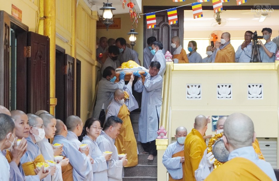 Trong tiếng niệm Phật nhất tâm của đại chúng, môn đồ pháp quyến đã cung thỉnh nhục thân Ni trưởng tân viên tịch từ phương trượng đến Giác linh đường để nhập kim quan.