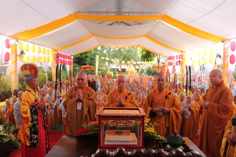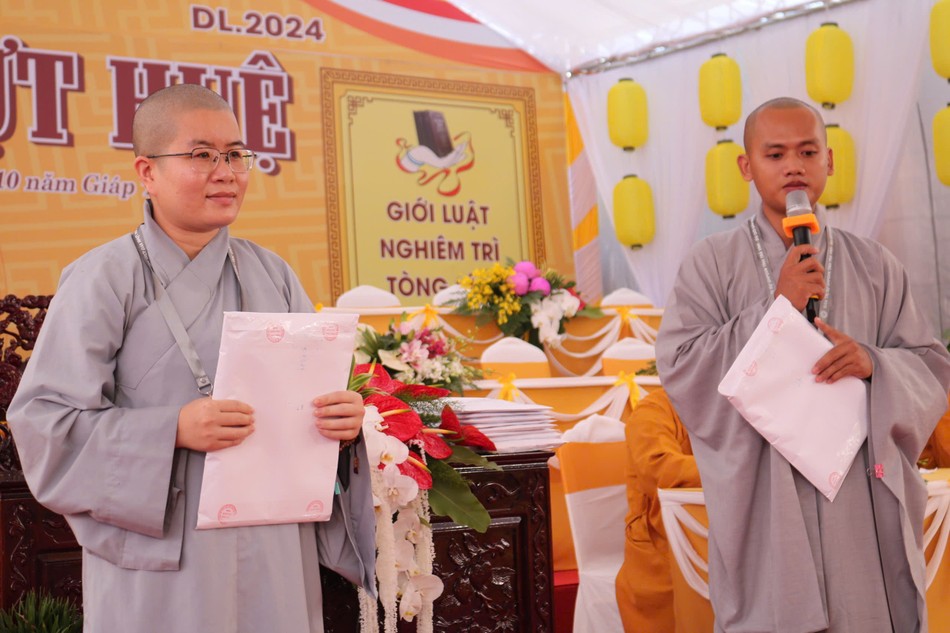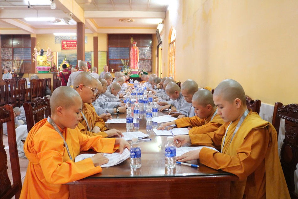 Ban Quản giới tử lần lượt phát đề thi, các giới tử chính thức bắt đầu làm bài. Được biết, nội dung thi bao gồm các kiến thức cơ bản trong Phật học phổ thông, Giới luật, Hiến chương GHPGVN và Quy chế Ban Tăng sự T.Ư.