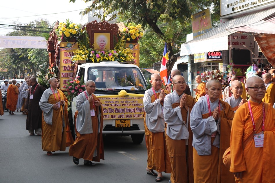 Hòa thượng Thích Trí Minh cùng chư tôn đức Ban Kiến đàn cung thỉnh pháp tướng và giới bổn Trưởng lão Hòa thượng Thích Nhựt Huệ về tôn trí tại điểm truyền giới - chùa Lưỡng Xuyên