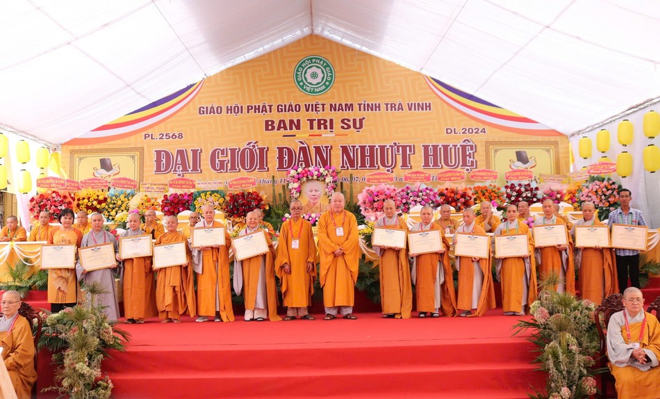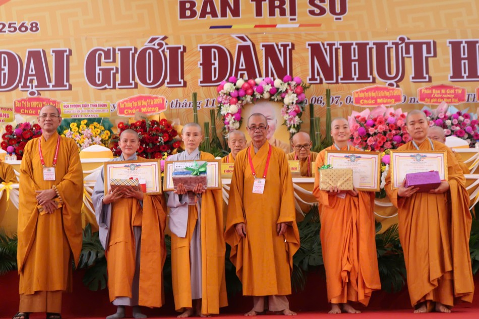 Tại buổi lễ, Ban Tổ chức đã trao tặng Bằng tuyên dương công đức đến chư tôn đức Hội đồng Thập sư Tăng - Ni, thành viên trong các tiểu ban đã đóng góp công đức vào sự thành tựu Đại giới đàn Nhựt Huệ Phật lịch 2568; trao tặng phần thưởng đến các giới tử đạt điểm thủ khoa các đàn giới.