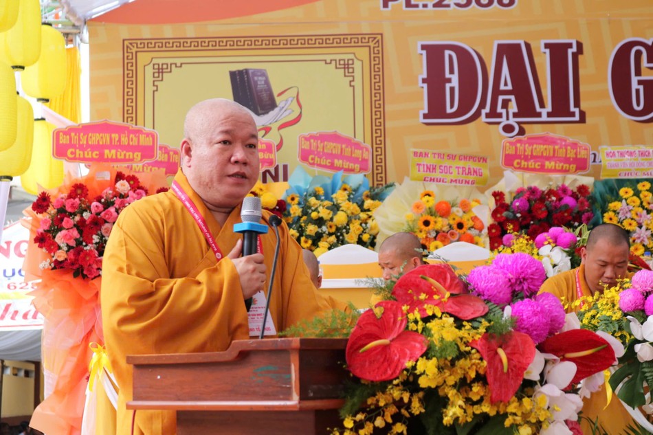 Đại đức Thích Thiện Đạo, Phó Chánh Văn phòng Ban Trị sự tỉnh báo cáo tiến trình tổ chức Đại giới đàn Nhựt Huệ Phật lịch 2568, các đàn giới được diễn ra thành tựu theo kế hoạch của Ban Tổ chức.