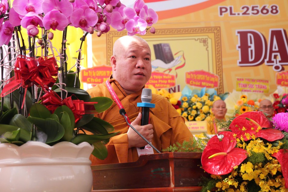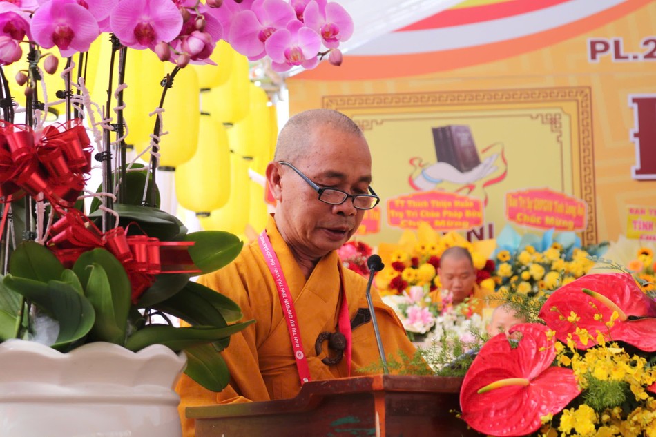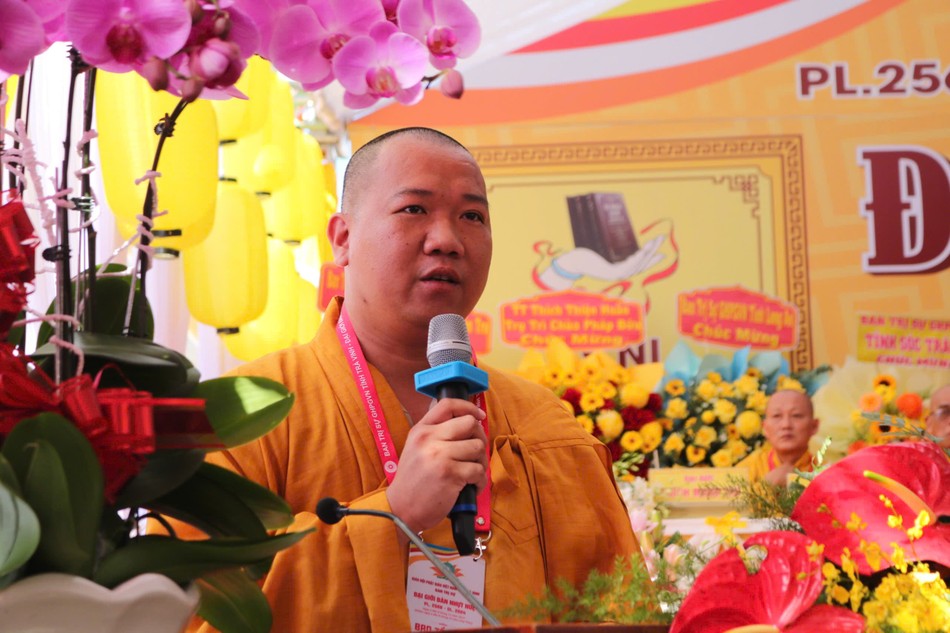 Đại đức Thích Minh Trí, Phó Chánh Thư ký kiêm Chánh Văn phòng Ban Trị sự GHPGVN tỉnh đã báo cáo quá trình tổ chức Đại giới đàn Nhựt Huệ Phật lịch 2568.