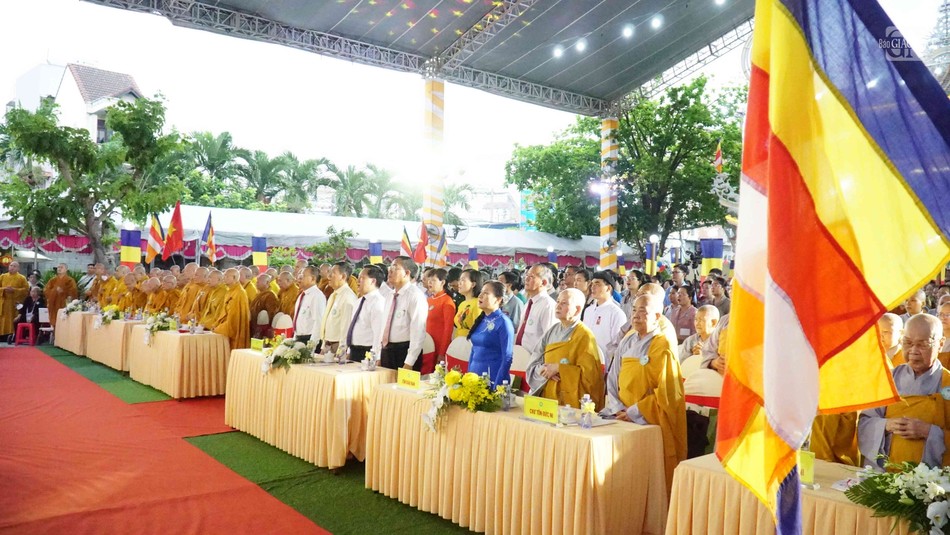 Sau nghi thức chào Quốc kỳ, Đạo kỳ, và phút nhập từ bi quán tưởng niệm, toàn thể hội chúng đã lắng lòng nghe Trưởng lão Hòa thượng Thích Minh Thông tuyên đọc Thông điệp Phật đản Phật lịch 2567 của Đức Pháp chủ GHPGVN.