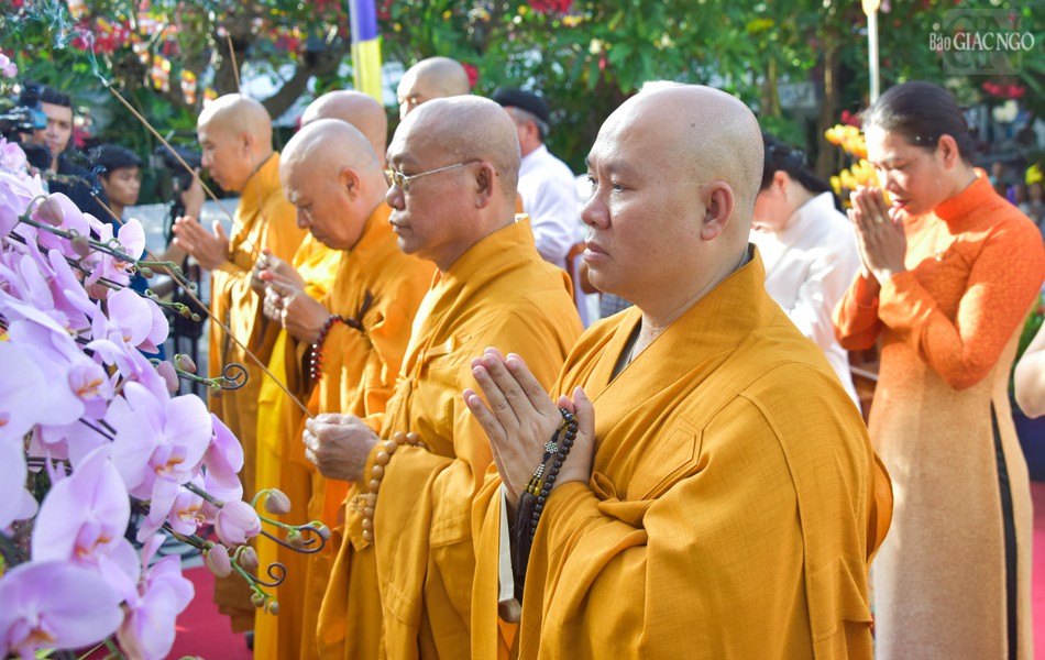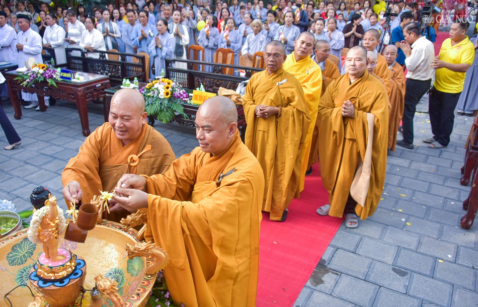 Trước tôn tượng Đức Phật sơ sinh, đại chúng thành kính dâng hương, đồng tụng thời sám Khánh đản và thực hiện nghi thức Tắm Phật nhân ngày Đản sinh của Ngài.