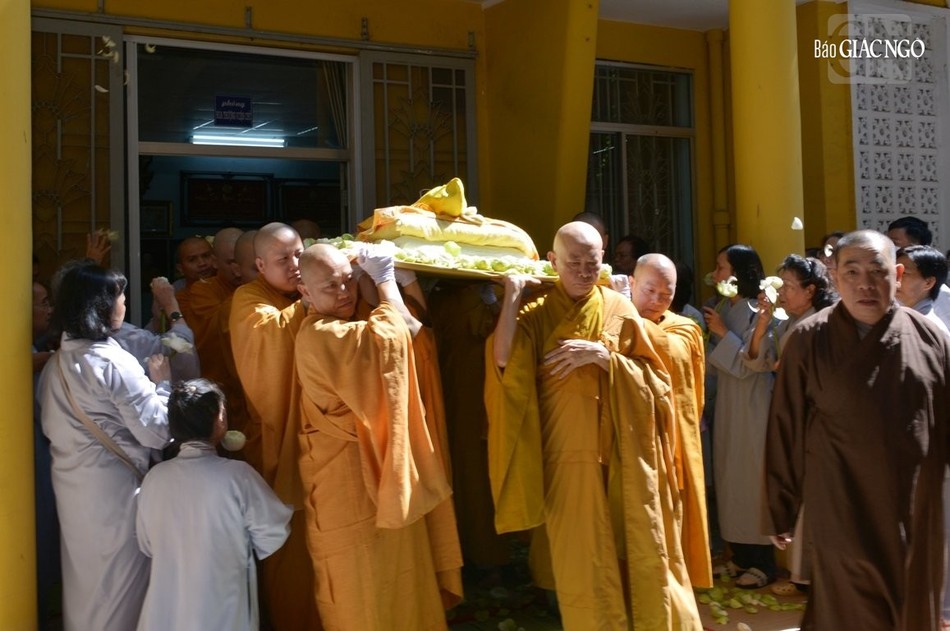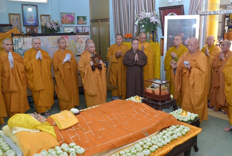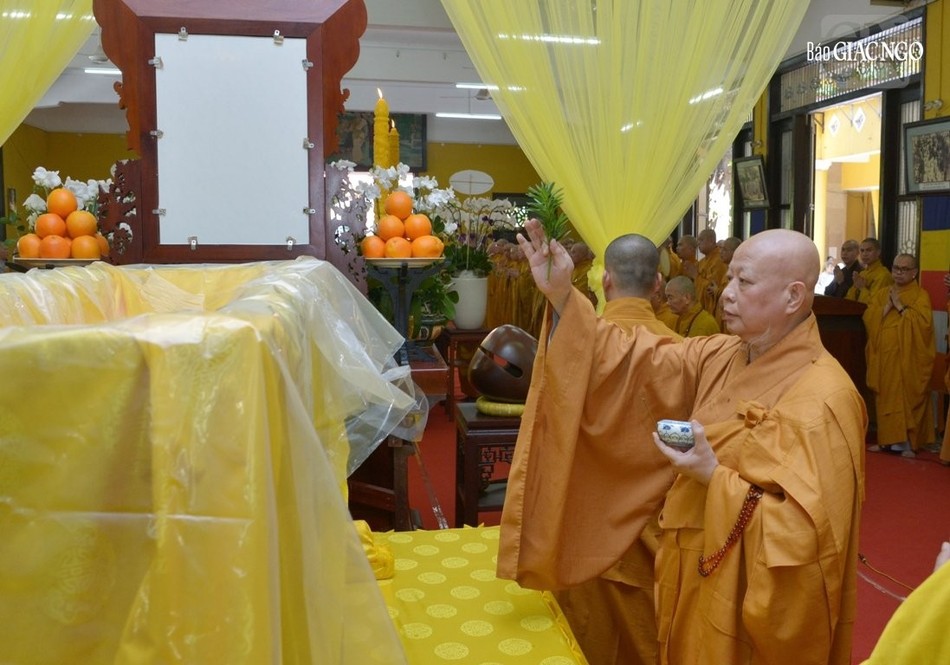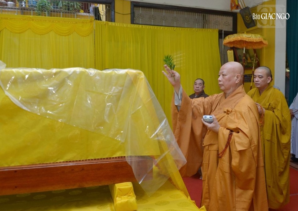 Tại giảng đường Chánh Trí, nơi tôn trí kim quan Trưởng lão Hòa thượng, chư vị giáo phẩm cử hương bạch Phật cầu nguyện, đồng thanh trì tụng Đại bi tâm kinh đà-la-ni hòa trong tiếng chuông trống Bát-nhã trầm hùng, Hòa thượng Thích Lệ Trang sám chủ cử hành nghi thức sái tịnh kim quan, sau đó các pháp tử của Trưởng lão Hòa thượng nhẹ nhàng cung thỉnh thân tứ đại của ngài phủ pháp y của người xuất gia, từ thiền thất hướng đến Giác linh đường nhập kim quan theo nghi thức truyền thống thiền môn.