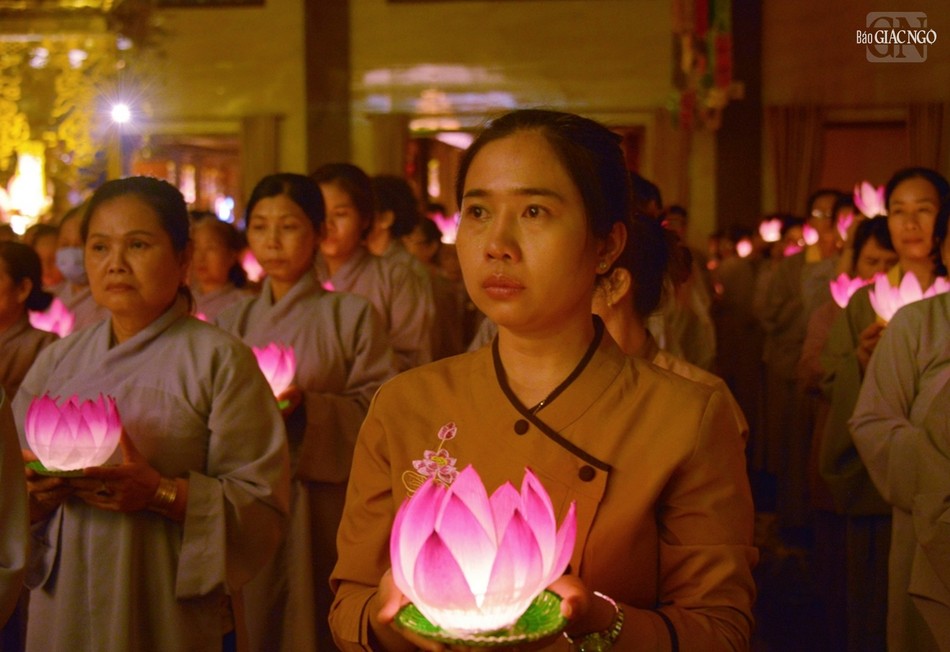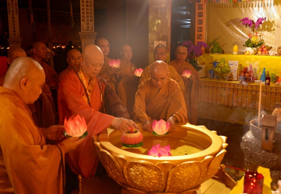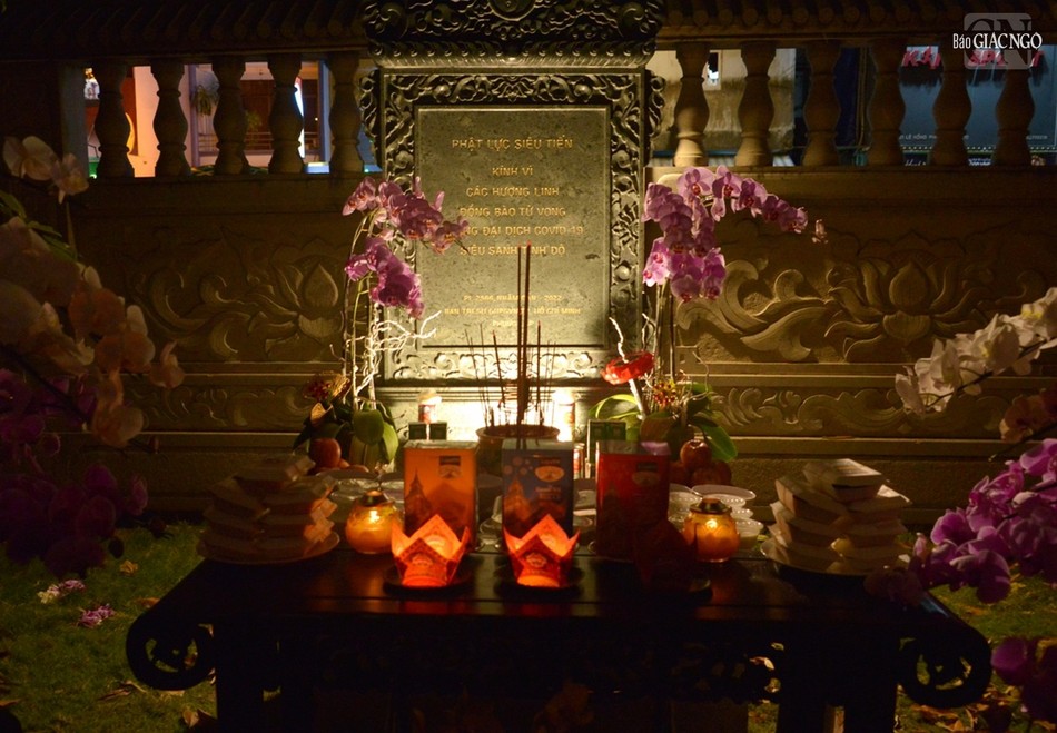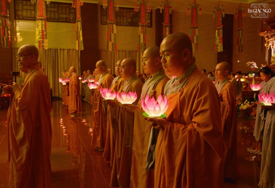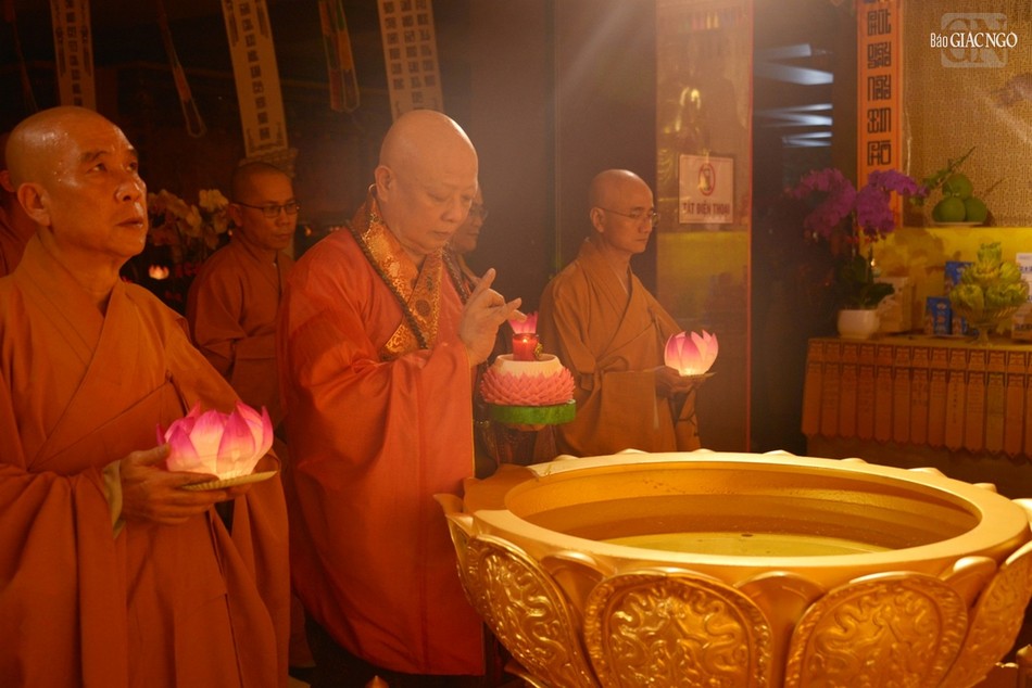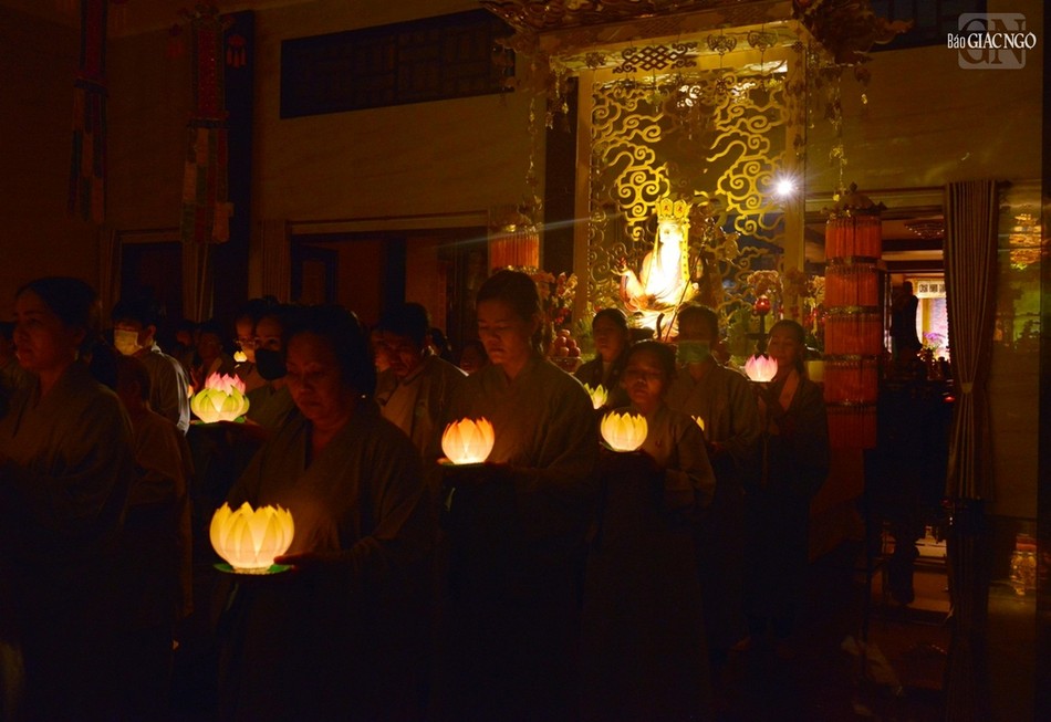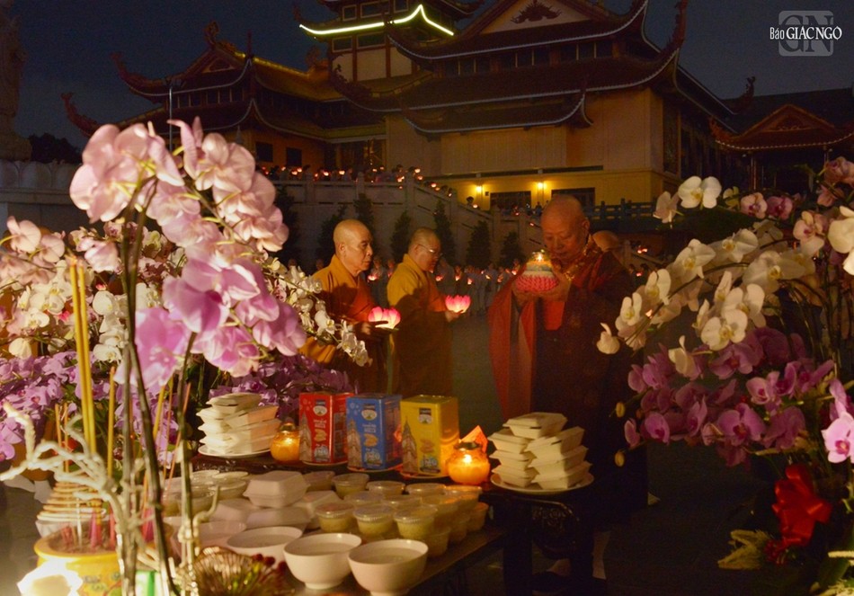 Trong tiếng niệm danh hiệu Bồ-tát Quán Thế Âm trầm hùng, Hòa thượng Trưởng ban Trị sự cùng chư tôn đức từ từ di chuyển thắp sáng đài Quán Thế Âm, bia tưởng niệm trong khuôn viên Việt Nam Quốc Tự, tháp Đa Bảo tại Việt Nam Quốc Tự và phóng liên đăng.
