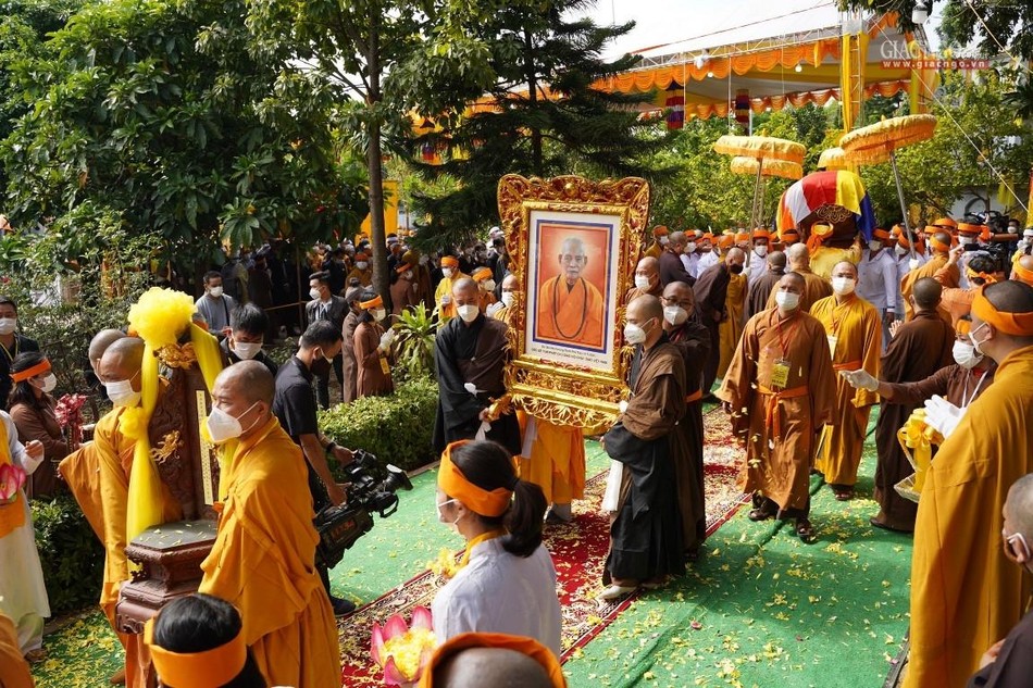 “Giờ đây, trong giây phút ngàn thu vĩnh biệt, trước linh đài hương trầm quyện tỏa, toàn thể Hội đồng Chứng minh, Hội đồng Trị sự, toàn thể Tăng, Ni và Phật tử chúng con xin thành kính thắp nén hương lòng cúng dường Giác linh Ngài. Kính nguyện Giác linh Đức Pháp chủ bất vong nguyện lực, tái hiện đàm hoa, phát triển đạo vàng, quang vinh họ Thích”, Trưởng lão Hòa thượng Đệ nhất Phó Pháp chủ kiêm Giám luật Hội đồng Chứng minh xúc động dâng lời tưởng niệm.