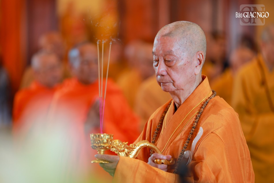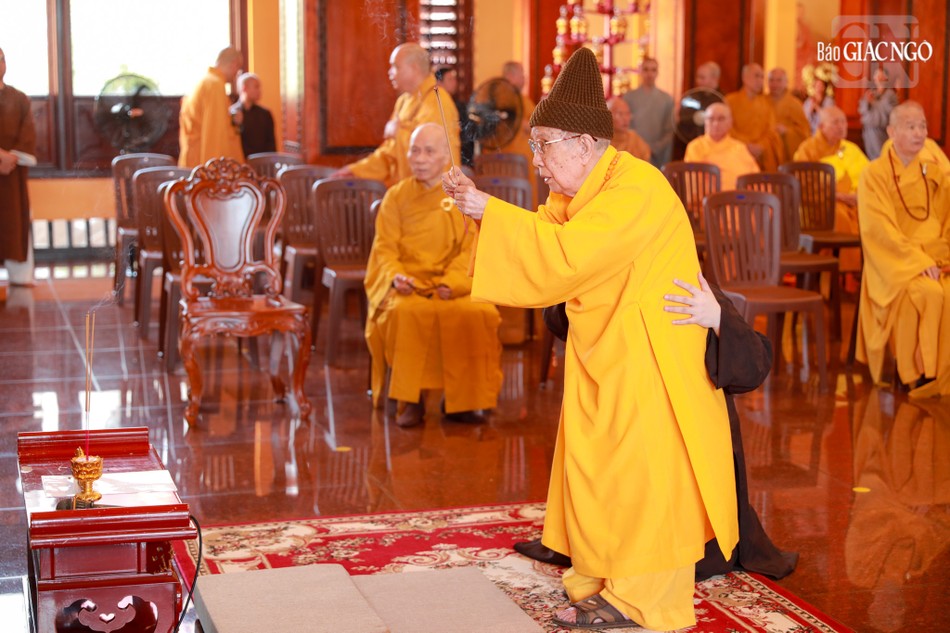 Đối trước hương án tưởng niệm Đức Đệ nhất Pháp chủ Thích Đức Nhuận (1897-1993), Đức Đệ nhị Pháp chủ Thích Tâm Tịch (1915-2005), Đức Đệ tam Pháp chủ Thích Phổ Tuệ (1917-2021) và hương án tôn trí long vị chư vị Trưởng lão Thành viên Hội đồng Chứng minh đã viên tịch, chư vị tiền bối hữu công GHPGVN quá cố qua các thời kỳ, Đức Pháp chủ cùng chư vị giáo phẩm Hội đồng Chứng minh đã dâng hương cúng dường, thành tâm tưởng niệm công đức cao dày của chư vị Pháp chủ, chư tôn Trưởng lão đã viên tịch.