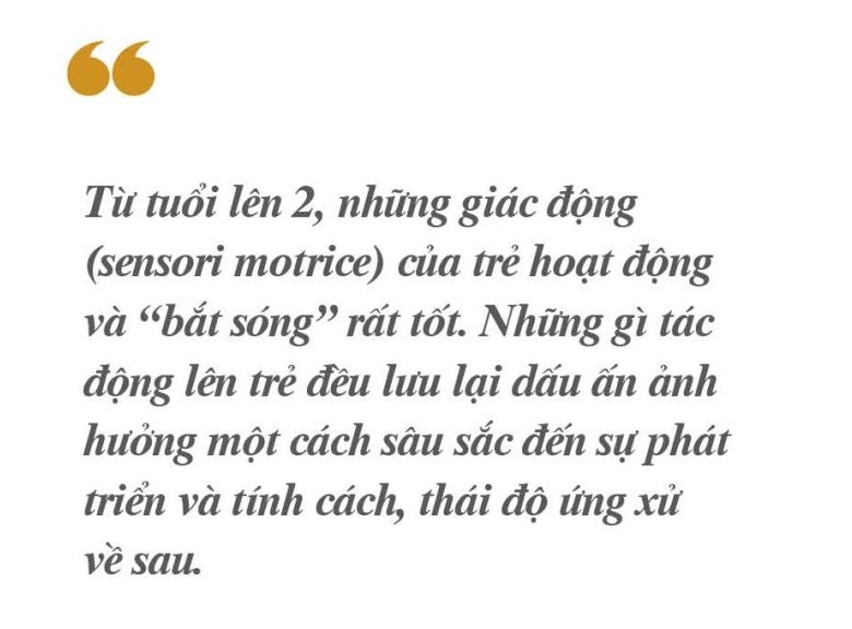 Từ tuổi lên 2, những giác động (sensori motrice) của trẻ hoạt động và “bắt sóng” rất tốt. Những gì tác động lên trẻ đều lưu lại dấu ấn ảnh hưởng một cách sâu sắc đến sự phát triển và tính cách, thái độ ứng xử về sau.
