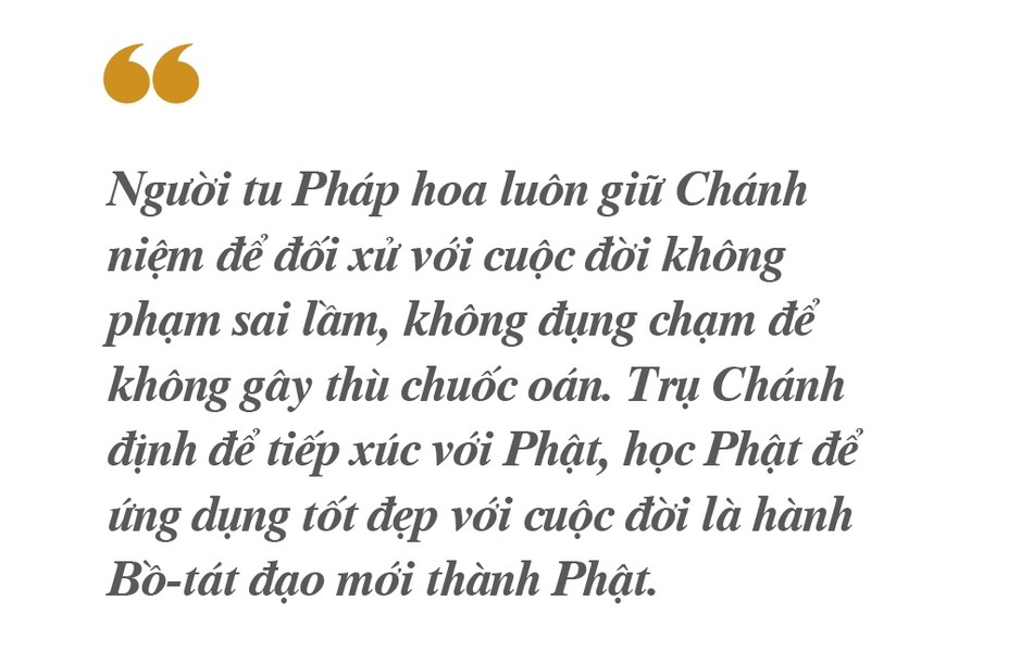 Người tu Pháp hoa luôn giữ Chánh niệm để đối xử với cuộc đời không phạm sai lầm, không đụng chạm để không gây thù chuốc oán. Trụ Chánh định để tiếp xúc với Phật, học Phật để ứng dụng tốt đẹp với cuộc đời là hành Bồ-tát đạo mới thành Phật.