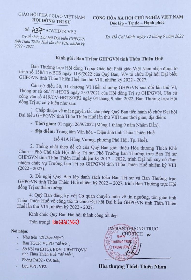 Theo đó, Trung ương GHPGVN chấp thuận về nguyên tắc cho phép tổ chức Đại hội đại biểu Phật giáo tỉnh Thừa Thiên Huế trong 1 ngày (26-9-2022, nhằm mùng 1-9-Nhâm Dần), tại Trung tâm Văn hóa - Điện ảnh tỉnh Thừa Thiên Huế (số 41A Hùng Vương, P.Phú Hội, TP.Huế).