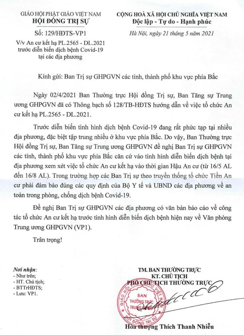 Trước diễn biến tình hình dịch bệnh Covid-19 đang rất phức tạp tại nhiều địa phương, đặc biệt tập trung nhiều ở khu vực phía Bắc. Do vậy, Ban Thường trực Hội đồng Trị sự, Ban Tăng sự Trung ương GHPGVN đề nghị Ban Trị sự GHPGVN các tỉnh, thành phố khu vực phía Bắc căn cứ vào tình hình diễn biến dịch bệnh tại địa phương xem xét việc tổ chức An cư kết hạ vào thời gian Hậu An cư (từ 16-5 Âm lịch đến 16-8 Âm lịch).