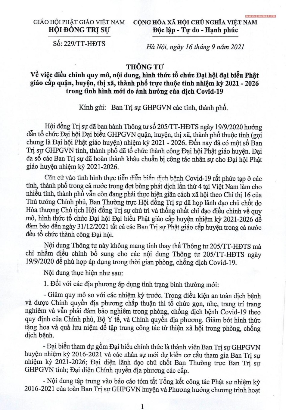 Căn cứ vào tình hình thực tiễn diễn biến dịch bệnh Covid-19 rất phức tạp ở các tỉnh, thành phố trong cả nước trong đợt bùng phát dịch lần thứ 4 tại Việt Nam làm cho nhiều tỉnh, thành phố vẫn còn đang phải thực hiện giãn cách xã hội theo Chỉ thị 16 của Thủ tướng Chính phủ, Ban Thường trực Hội đồng Trị sự đã họp lãnh đạo chủ chốt do Hòa thượng Chủ tịch Hội đồng Trị sự chủ trì và thống nhất chỉ đạo điều chỉnh về quy mô, hình thức tổ chức Đại hội Đại biểu Phật giáo cấp huyện nhiệm kỳ 2021-2026 để đảm bảo đến ngày 31-12-2021 tất cả các Ban Trị sự Phật giáo cấp huyện trong cả nước đều tổ chức thành công Đại hội.