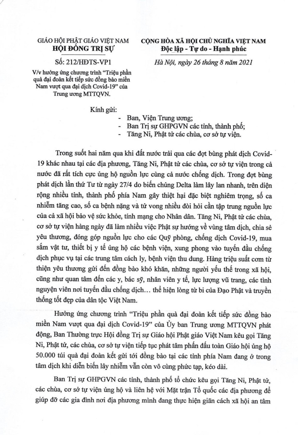 Hưởng ứng chương trình “Triệu phần quà đại đoàn kết tiếp sức đồng bào miền Nam vượt qua đại dịch Covid-19” của Ủy ban Trung ương MTTQVN phát động, Ban Thường trực Hội đồng Trị sự GHPGVN kêu gọi Tăng Ni, Phật tử, các chùa, cơ sở tự viện tiếp tục phát tâm phấn đấu toàn Giáo hội ủng hộ 50.000 túi quà đại đoàn kết gửi tới đồng bào tại các tỉnh phía Nam đang ở trong tâm dịch khi diễn biến lây nhiễm vẫn còn vô cùng phức tạp, kéo dài.