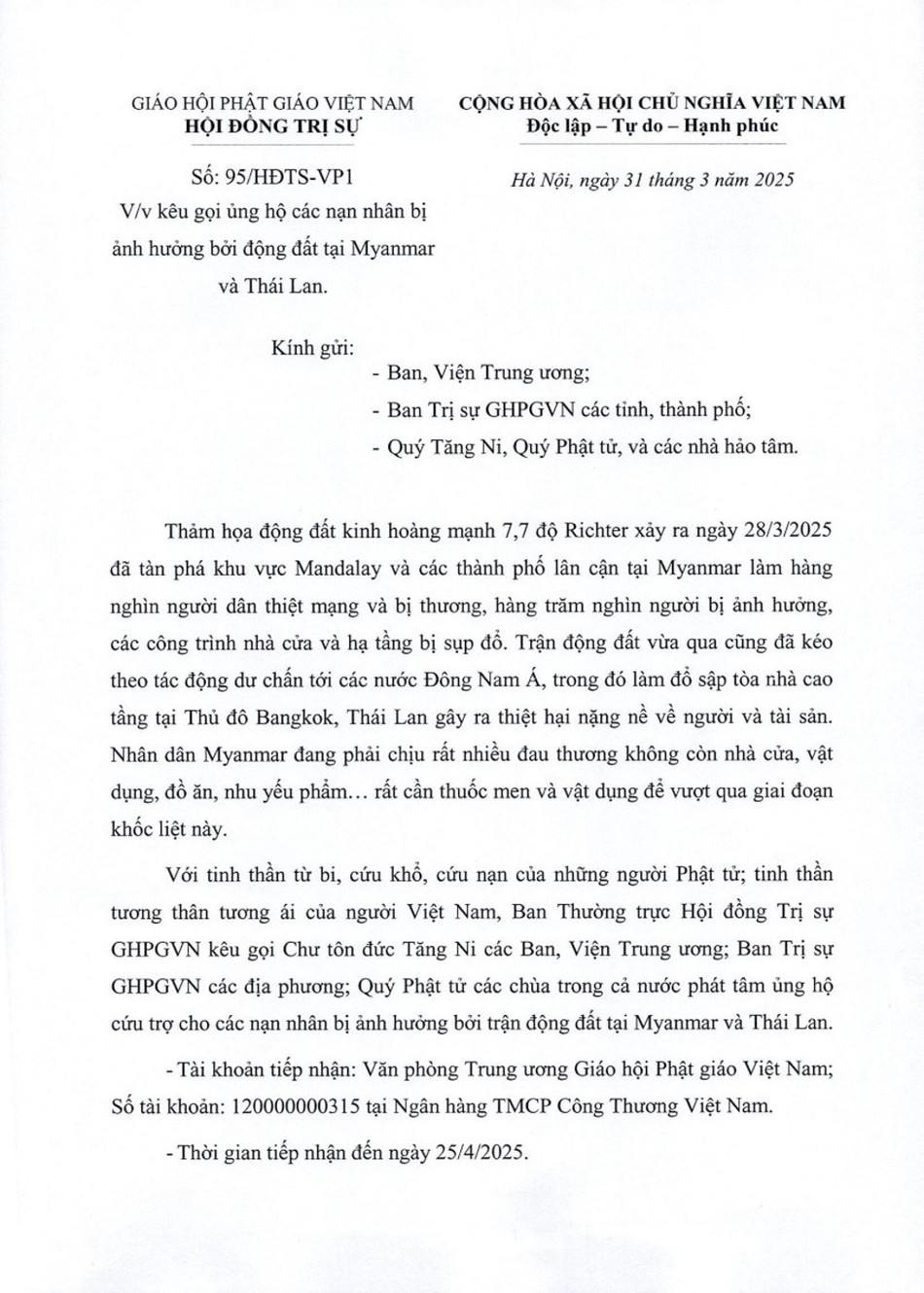 Các nguồn ủng hộ có thể chuyển về Văn phòng Trung ương GHPGVN qua số tài khoản 120000000315 tại Ngân hàng TMCP Công Thương Việt Nam; thời gian tiếp nhận từ nay đến ngày 25-4-2025.