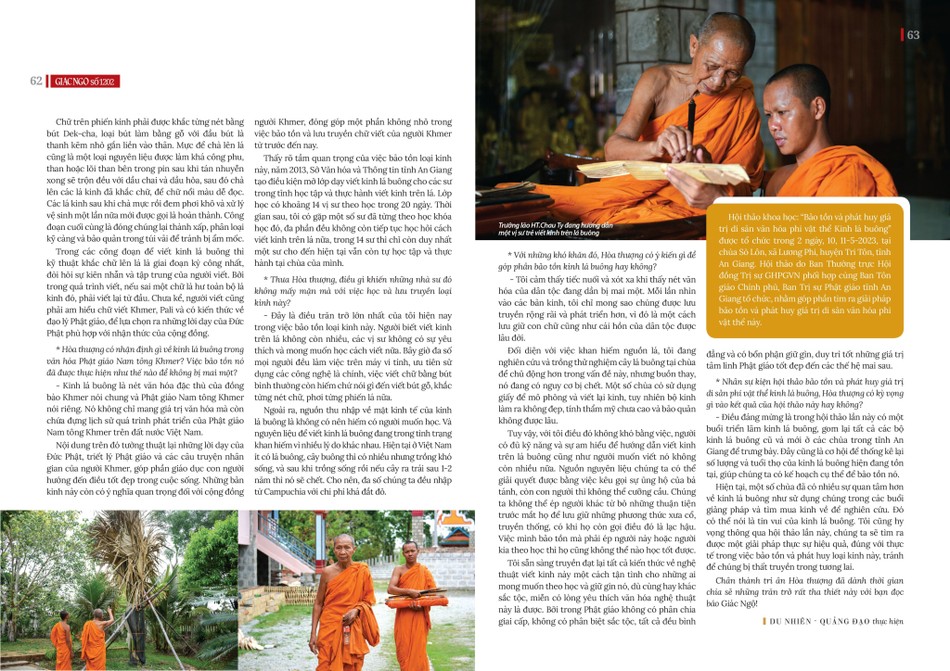 Trước thực trạng đó, Hòa thượng Chau Ty, Phó Pháp chủ Hội đồng Chứng minh, vị giáo phẩm Khmer năm nay đã 82 tuổi, hiện trụ trì chùa Soài So (H.Tri Tôn, tỉnh An Giang), được xem là người duy nhất còn lại thông thạo kỹ thuật viết kinh lá buông tại An Giang hiện nay, đã có cuộc trò chuyện với báo Giác Ngộ về những trăn trở trong việc bảo tồn loại kinh này.