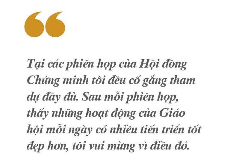 Hiện tại, tuổi đã cao và sức khỏe cũng có nhiều hạn chế nên không thể cống hiến nhiều hơn cho công việc của Giáo hội cũng như các công tác của Hội đồng Chứng minh. Tại các phiên họp của Hội đồng Chứng minh tôi đều cố gắng tham dự đầy đủ. Sau mỗi phiên họp, thấy những hoạt động của Giáo hội mỗi ngày có nhiều tiến triển tốt đẹp hơn, tôi vui mừng vì điều đó.