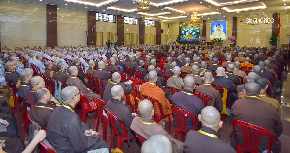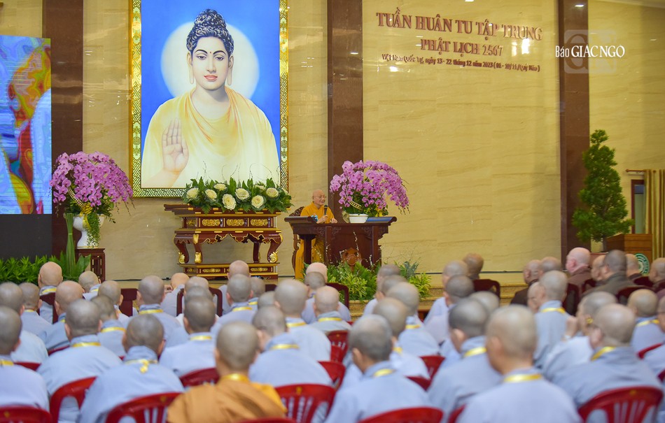 GNO - Sáng 15-12, tại hội trường Việt Nam Quốc Tự, Trưởng lão Hòa thượng Thích Minh Thông, Ủy viên Thường trực Hội đồng Chứng minh, Chứng minh Ban Trị sự GHPGVN TP.HCM quang lâm triển khai chủ đề "Giới luật Phật giáo" đến hơn 700 Tăng Ni trong Khóa huân tu tập trung và Bồi dưỡng trụ trì Phật lịch 2567.