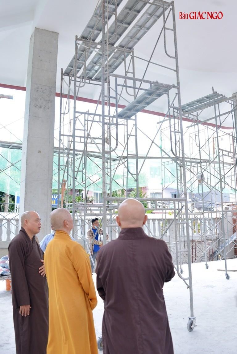 Trưởng lão Hòa thượng đã lắng nghe báo cáo, xem xét thiết kế và phối cảnh các hạng mục xây dựng mới, cùng chư Hòa thượng, Thượng tọa chỉ đạo điều chỉnh một số chi tiết phù hợp với thực tế và yêu cầu sử dụng của cơ sở tự viện này.