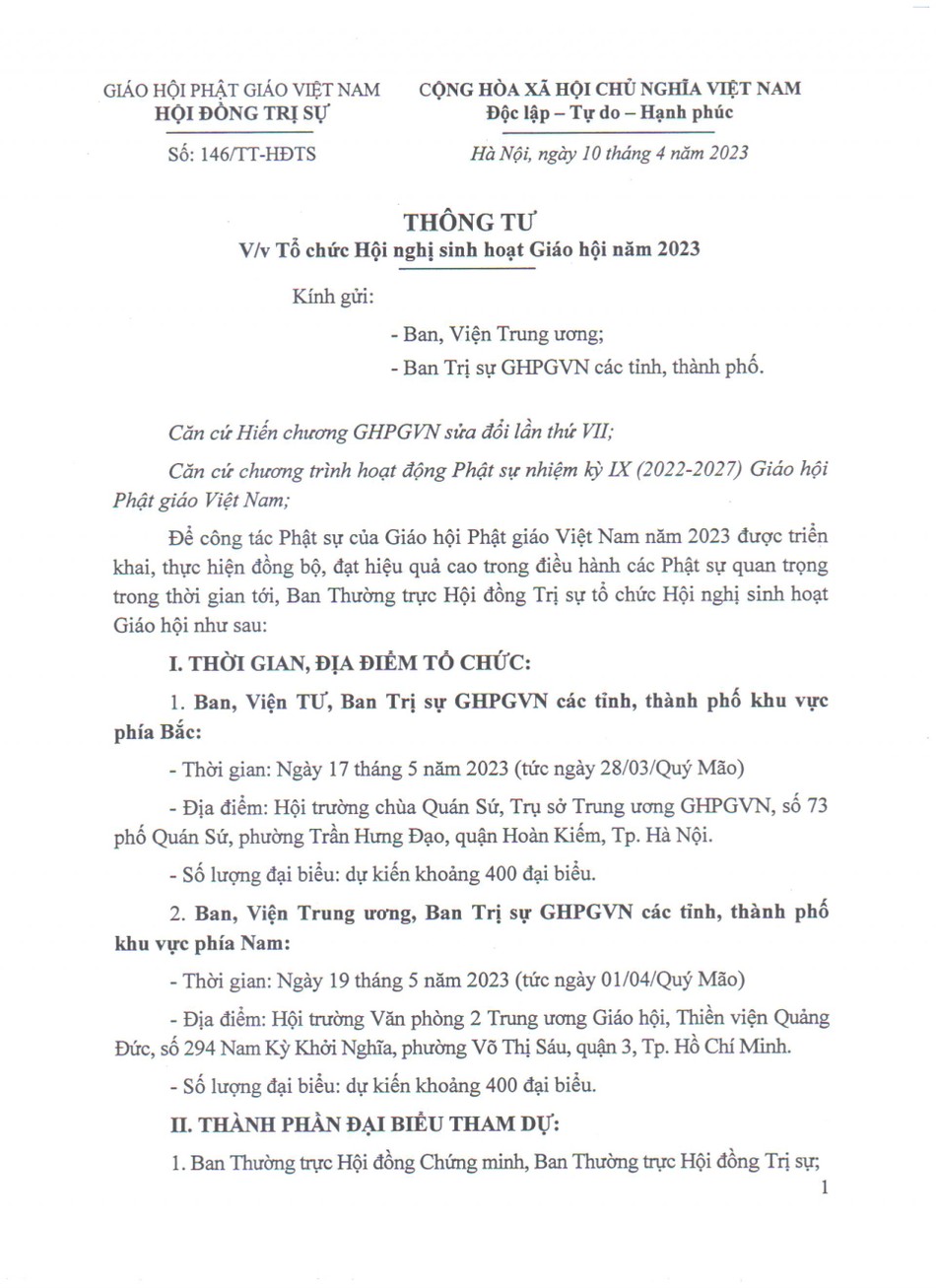 Thông tư đề nghị, để công tác tổ chức hội nghị sinh hoạt Giáo hội năm 2023 đạt kết quả tốt góp phần thực hiện thành công các chương trình hoạt động Phật sự của GHPGVN nhiệm kỳ IX, Ban Thường trực Hội đồng Trị sự đề nghị các Ban thực hiện tốt nội dung thông tư này.