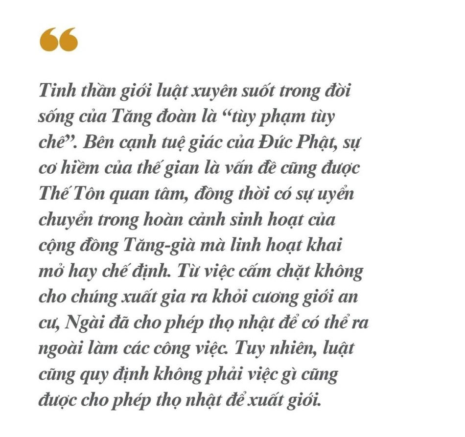 Tinh thần giới luật xuyên suốt trong đời sống của Tăng đoàn là “tùy phạm tùy chế”. Bên cạnh tuệ giác của Đức Phật, sự cơ hiềm của thế gian là vấn đề cũng được Thế Tôn quan tâm, đồng thời có sự uyển chuyển trong hoàn cảnh sinh hoạt của cộng đồng Tăng-già mà linh hoạt khai mở hay chế định. Từ việc cấm chặt không cho chúng xuất gia ra khỏi cương giới an cư, Ngài đã cho phép thọ nhật để có thể ra ngoài làm các công việc. Tuy nhiên, luật cũng quy định không phải việc gì cũng được cho phép thọ nhật để xuất giới. Các việc có thể xuất giới: đàn-việt thỉnh cúng dường; Tỳ-kheo, Tỳ-kheo-ni, Sa-di… thỉnh các việc xuất tội, thọ giới…; việc của cha mẹ thân quyến(22)…