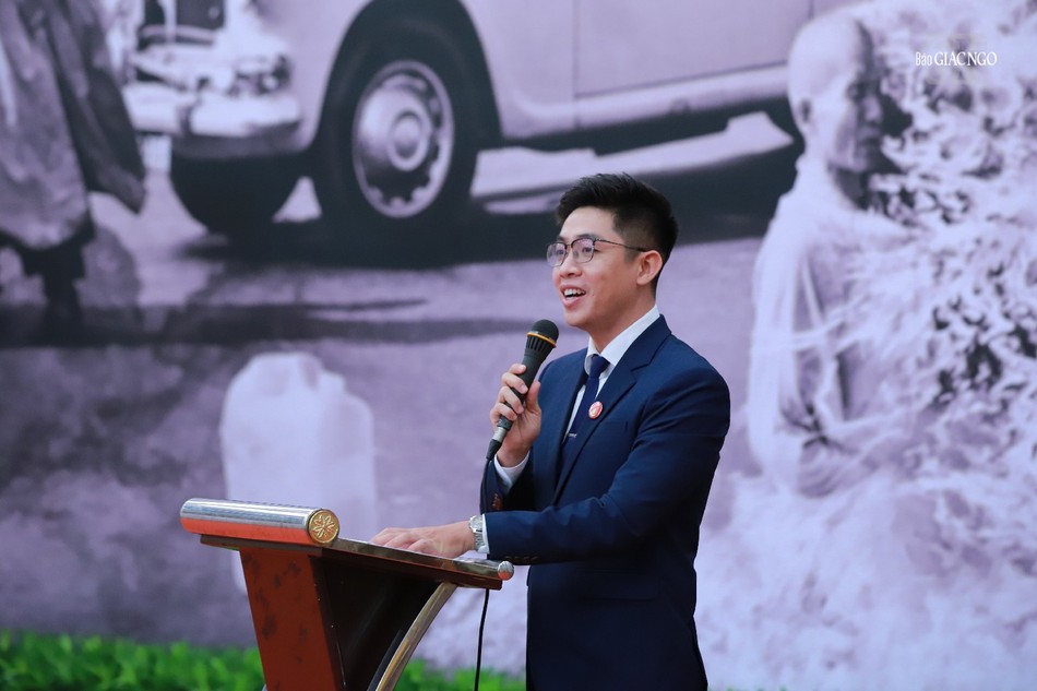 Anh Nguyễn Vĩnh Kha thay mặt lực lượng tình nguyện viên, sinh viên các trường đại học tham gia phụng sự phát biểu |