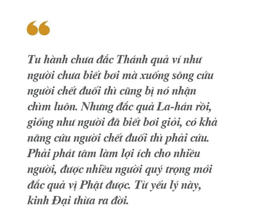Ngoài ra, Phật dạy các vị đắc La-hán, không còn phiền não cũng nên phát tâm độ sanh. Lúc trước, tu hành chưa đắc Thánh quả ví như người chưa biết bơi mà xuống sông cứu người chết đuối thì cũng bị nó nhận chìm luôn. Nhưng đắc quả La-hán rồi, giống như người đã biết bơi giỏi, có khả năng cứu người chết đuối thì phải cứu. Phải phát tâm làm lợi ích cho nhiều người, được nhiều người quý trọng mới đắc quả vị Phật được. Từ yếu lý này, kinh Đại thừa ra đời.