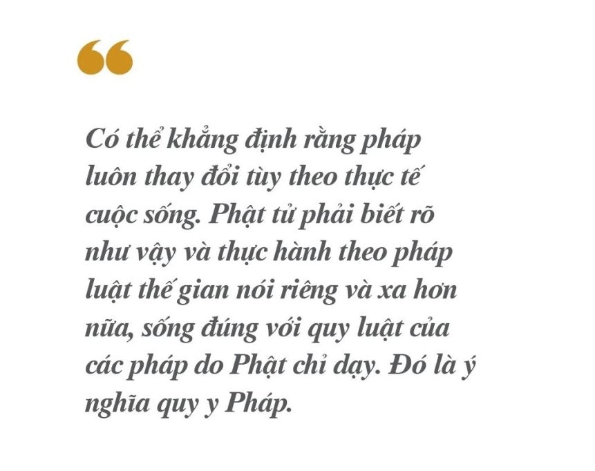 Vì vậy, Phật nói ba pháp khác nhau với ba đối tượng khác nhau ở ba hoàn cảnh khác nhau như vừa nói trên. Có thể khẳng định rằng pháp luôn thay đổi tùy theo thực tế cuộc sống. Phật tử phải biết rõ như vậy và thực hành theo pháp luật thế gian nói riêng và xa hơn nữa, sống đúng với quy luật của các pháp do Phật chỉ dạy. Đó là ý nghĩa quy y Pháp.