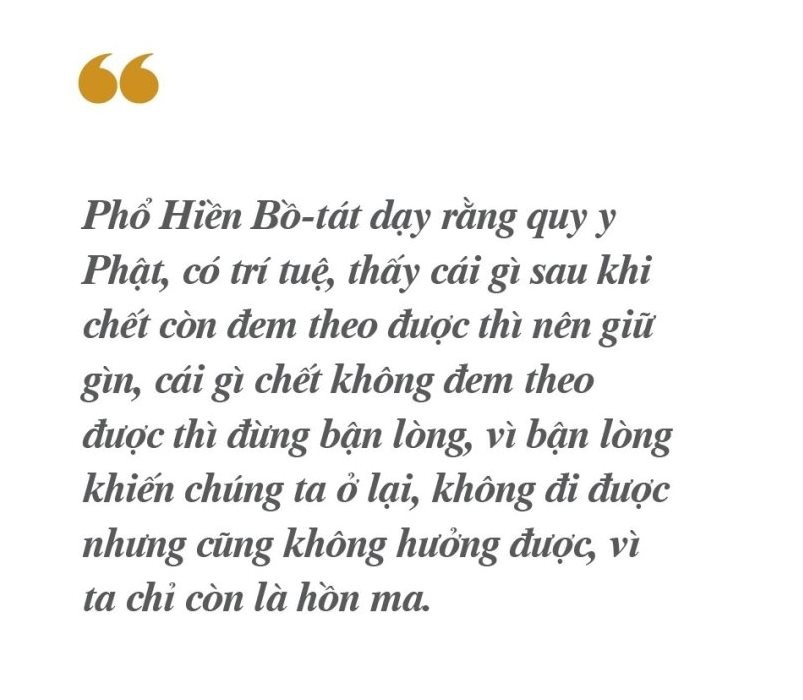 Ta nhận được pháp Tam quy và thực hành có kết quả, từ đó, chúng ta tu Tiểu thừa là lo tìm đường giải thoát, vì sắp chết không biết đi về đâu. Phật chỉ chúng ta về Cực lạc, hay lên Niết-bàn. Muốn lên Niết bàn, phải gạn lọc tất cả những gì của trần gian, như tiền của, sự nghiệp vật chất, chúng ta bỏ lại. Nếu còn tâm luyến tiếc, chết sẽ ở lại thành ma quỷ. Để không phạm sai lầm này, Phổ Hiền Bồ-tát dạy rằng quy y Phật, có trí tuệ, thấy cái gì sau khi chết còn đem theo được thì nên giữ gìn, cái gì chết không đem theo được thì đừng bận lòng, vì bận lòng khiến chúng ta ở lại, không đi được nhưng cũng không hưởng được, vì ta chỉ còn là hồn ma.